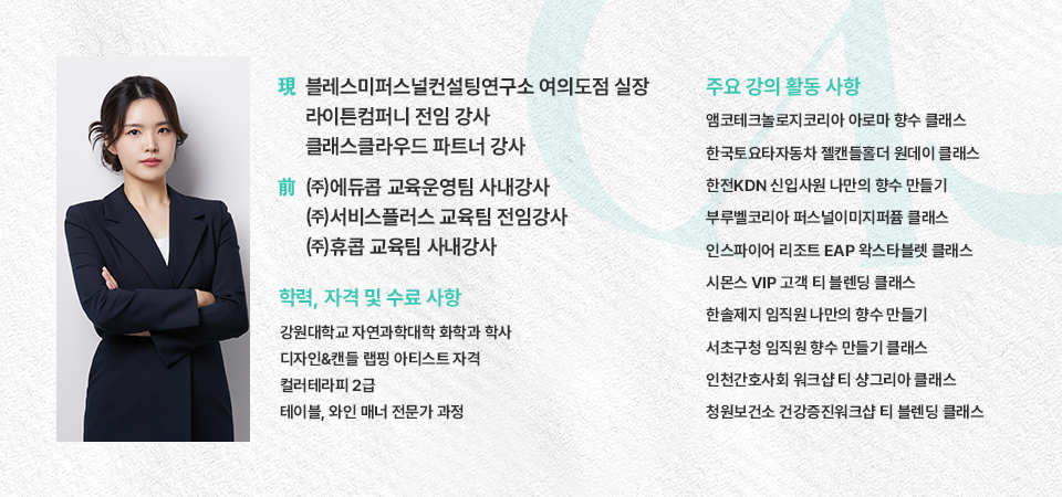 나만의 향기를 직접 만들며 심리적 안정과 자존감을 회복할 수 있습니다.