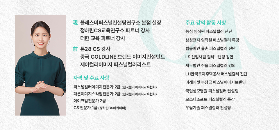 - 호감 이미지 형성을 위한 퍼스널 컬러 스타일링 노하우를 활용한다.